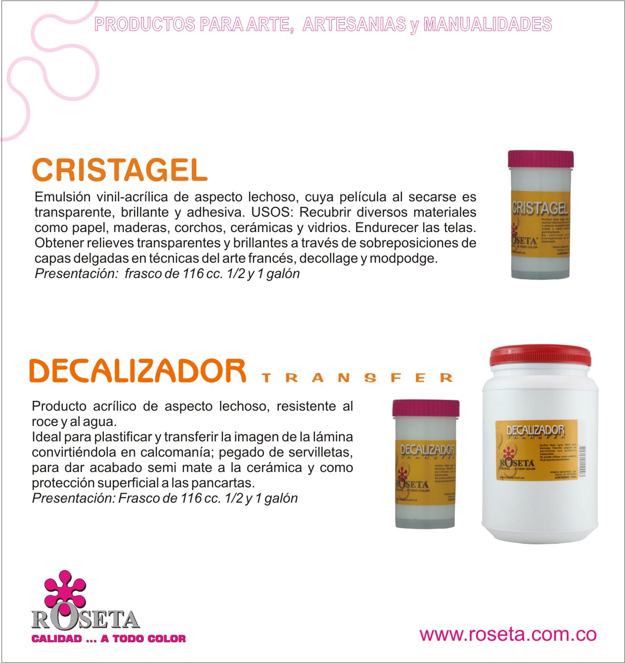 Emulsión vinil-acrílica de aspecto lechoso, cuya película es transparente, brillante y adhesiva. USOS: Recubrir diversos materiales como papel, maderas, corchos, cerámicas y vidrios. Endurecer las telas Adhesivo. Obtener relieves transparentes y brillantes a través de sobreposiciones de capas delgadas en técnicas del arte francés, decollage y modpodge.